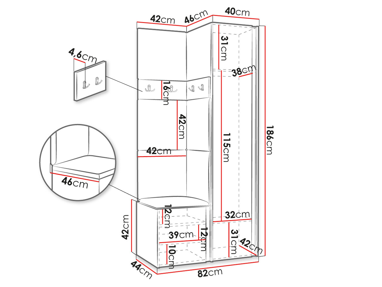 186 cm  42 cm  46 cm