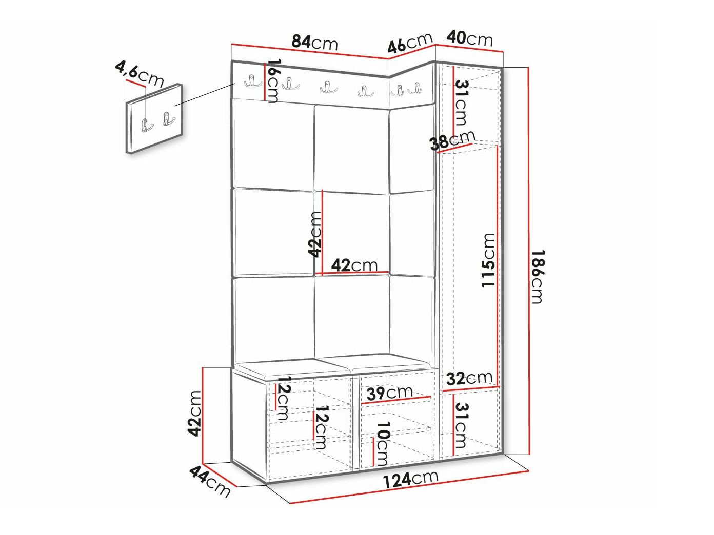 186 cm  42 cm  46 cm