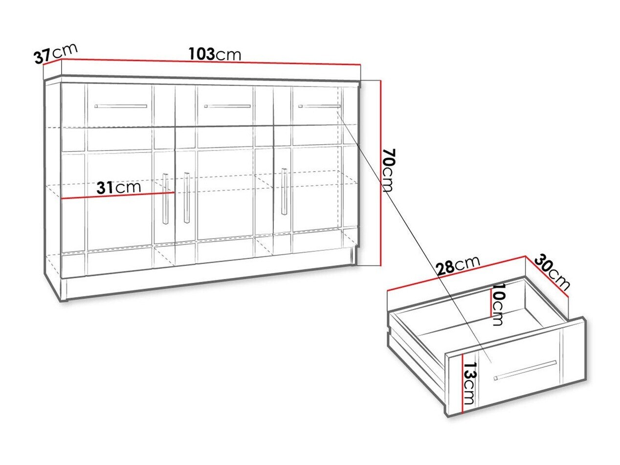 Voldeed iets niet aan mijn eisen qua kleur (lichte kleur Sonoma Oak, maar toch net iets anders dan de kast Tuscon 149 Sonoma Oak). Maar er zijn geen opmerkingen over de afmetingen - alle maten zijn exact gespecificeerd en er waren geen afwijkingen. Het is ook een goede regeling van interne volumes, die ik nodig heb.
