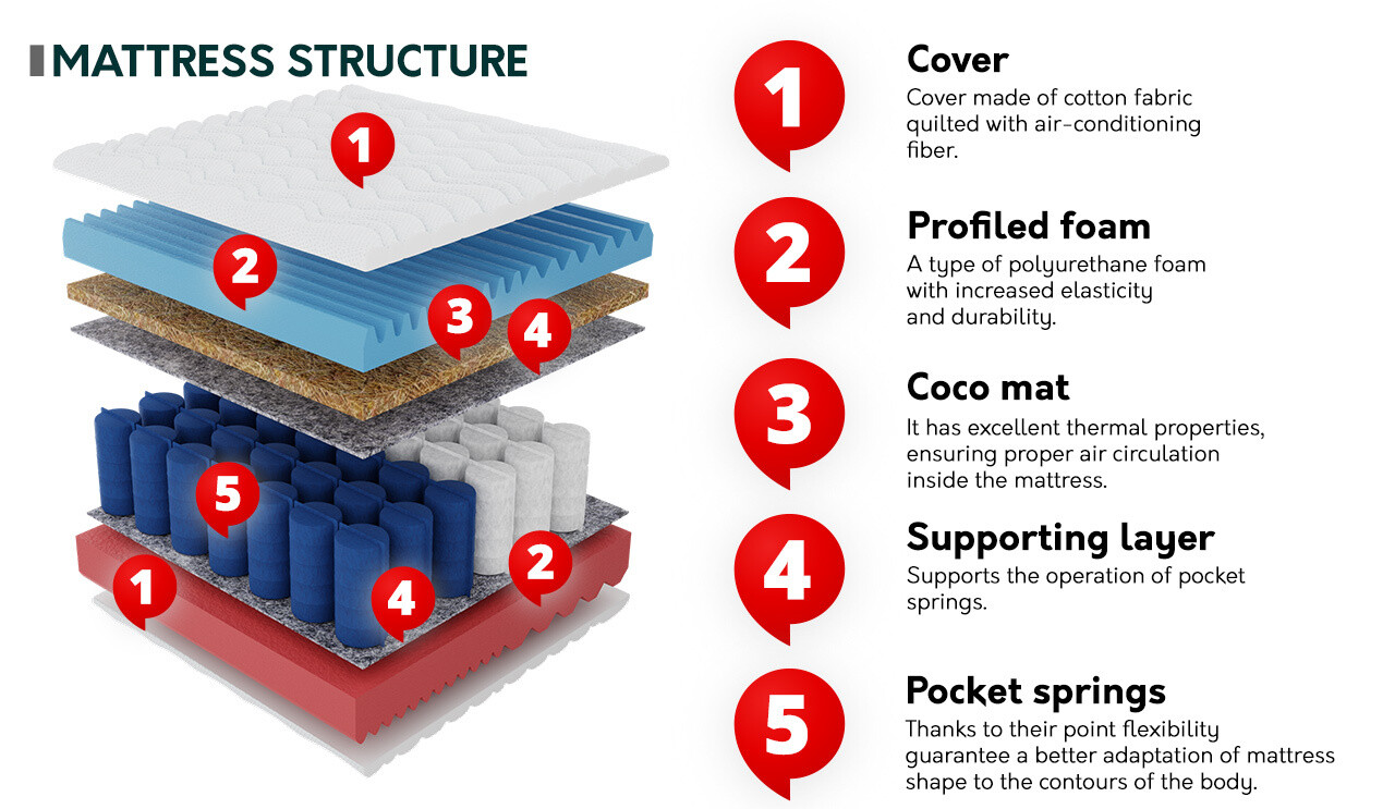 Elke veer in de matras zit in een aparte zak. Hierdoor beweegt elke veer afzonderlijk en worden bewegingen niet doorgegeven aan een persoon die in de buurt slaapt. De zakken rond de veren beschermen ze tegen kraken. Veren ondersteunen het lichaam precies waar het lichaamsgewicht zich bevindt en zorgen voor de juiste positie van de wervelkolom tijdens de slaap. Dit type veren zorgt voor een uitstekende luchtcirculatie, waardoor de matrassen verkoelende eigenschappen hebben.