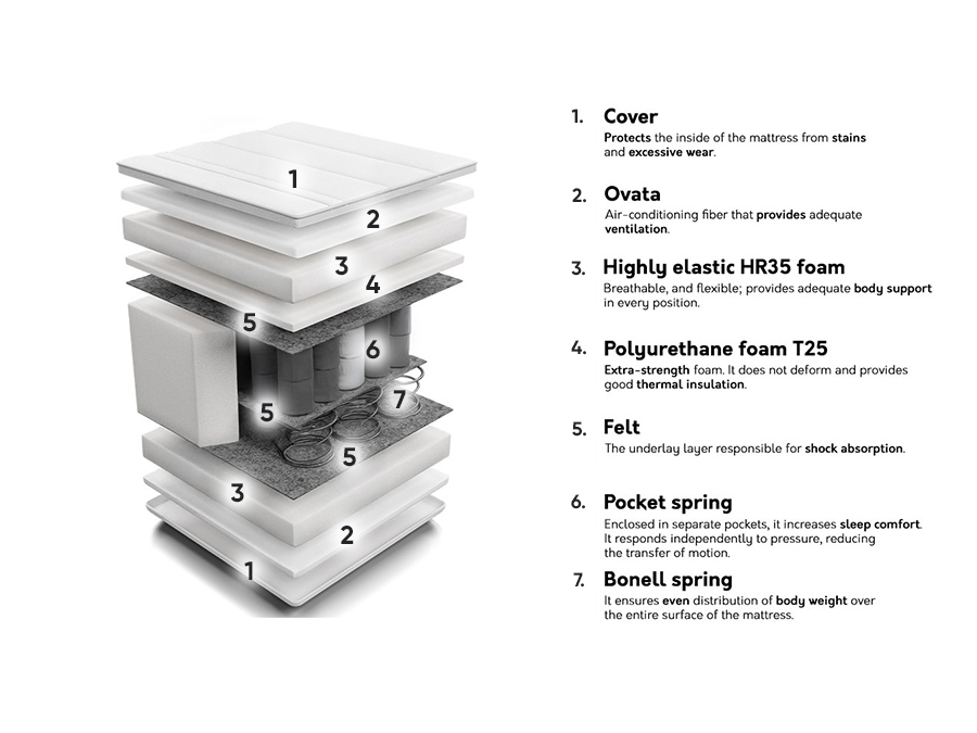 De basis van de matras is ontworpen om het lichaamsgewicht gelijkmatig te verdelen en volledig te laten ontspannen. Twee verschillende zachtheidsvullingen worden gebruikt om de hardheidszones te benadrukken. De meest onder druk staande matraszones zoals schouders, billen en kuiten zijn zachter. En de gebieden bij het hoofd, de taille, de dijen en de voeten zijn stijver. Dankzij deze verdeling kunnen mensen de juiste positie van de wervelkolom handhaven en de spieren maximaal ontspannen.