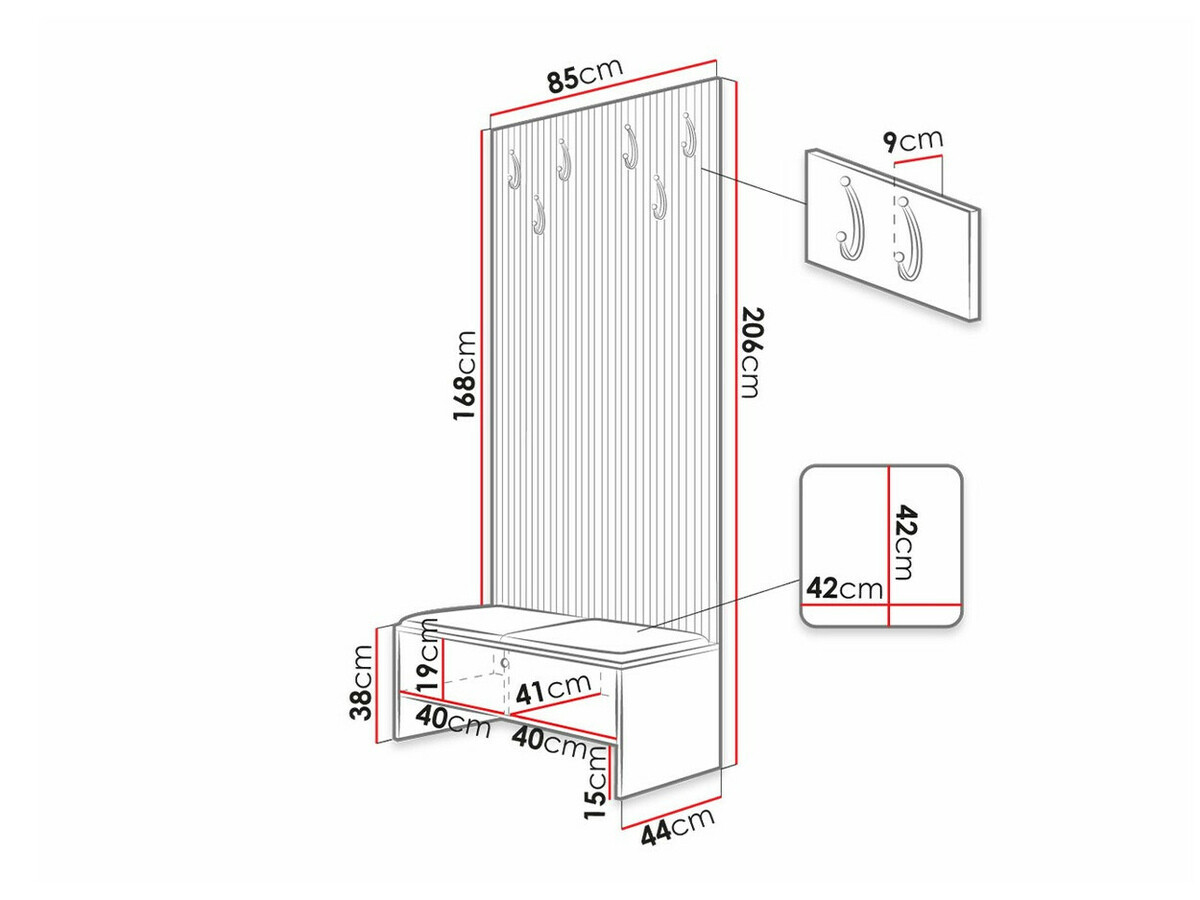 Het onderste deel van de kast is normaal. Het is mogelijk om de kussens van het zitgedeelte af te dekken, mocht dat nodig zijn. Het wanddeel zit helemaal niet vast aan het onderste deel. Het is gewoon een plank om aan de muur te hangen. Teleurstelling. Decoratieve verticale planken zijn kunststof latten. Teleurstelling. De zwarte hangers zijn van plastic en zien er goedkoop uit. Teleurstelling.