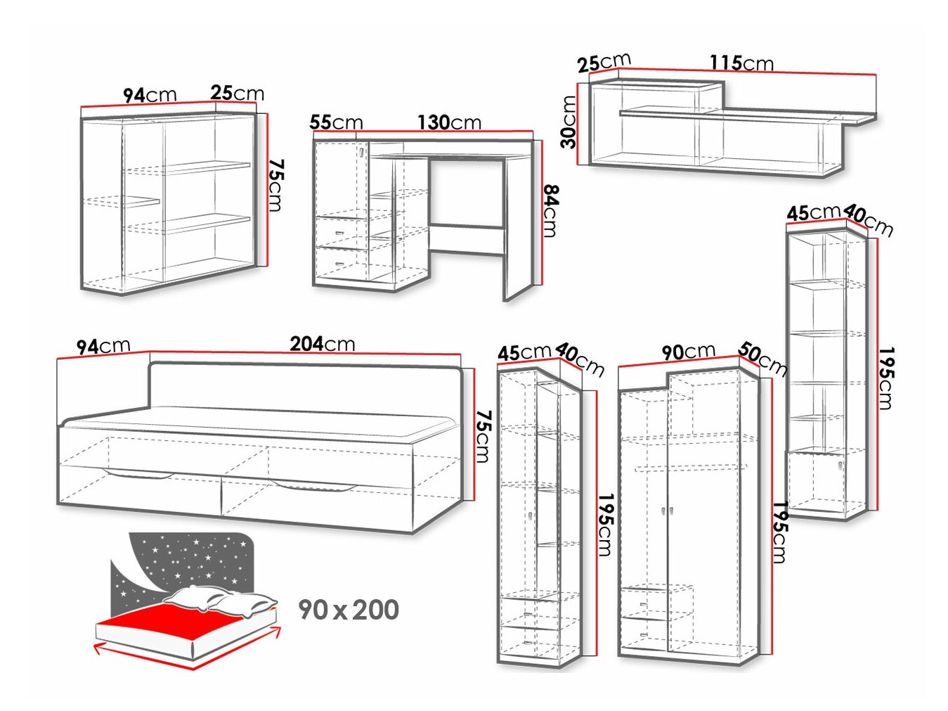 195 x 45 x 40; 75 x 94 x 25 cm