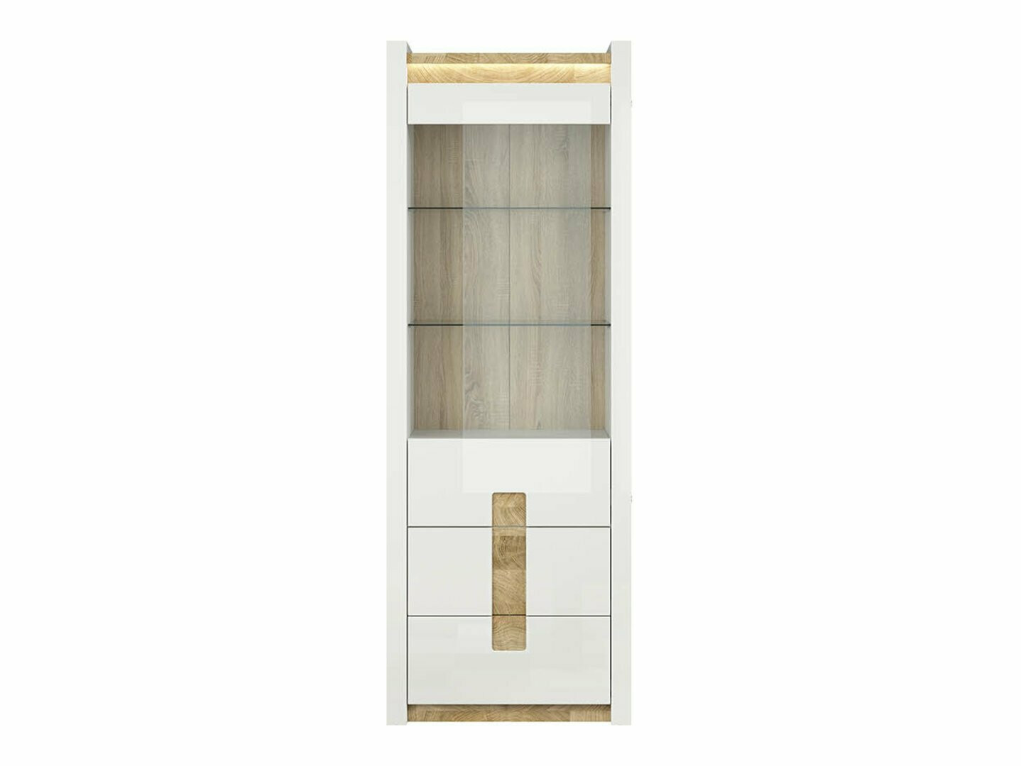 Houtkleurige details geven comfort en zien er geweldig uit in het interieur. Deze meubelcollectie is uniek omdat ze een ruime keuze aan meubelmodellen biedt voor verschillende woonruimtes. Creëer een solide interieur in zowel de woonkamer als de slaapkamer. Wat als de meubels ook in de gang passen? Of in het kantoor? Dat is allemaal mogelijk met deze collectie. Het lichte kleurenpalet komt zowel in kleine als grote ruimtes goed tot zijn recht. De gevels van de meubels worden gedomineerd door glanzend wit, dat perfect wordt aangevuld met houtkleurige details. De kleur en de patronen van het hout komen prachtig tot uiting in de meubilairtafels, wat een gevoel van gezelligheid geeft. Ook de greepoplossing springt in het oog, die niet alleen past als handvat, maar ook als decoratief detail. Er zal zeker genoeg ruimte zijn om spullen op te bergen, het meubel heeft voldoende laden en planken. Voor extra charme zorgt de geïntegreerde energiebesparende LED-verlichting. Deze oplossing zal u laten genieten van een gezellig licht dat de houtkleurige inzetstukken zal benadrukken. Het geruisloze sluitmechanisme zal ervoor zorgen dat de deuren en laden niet snel dichtvallen.