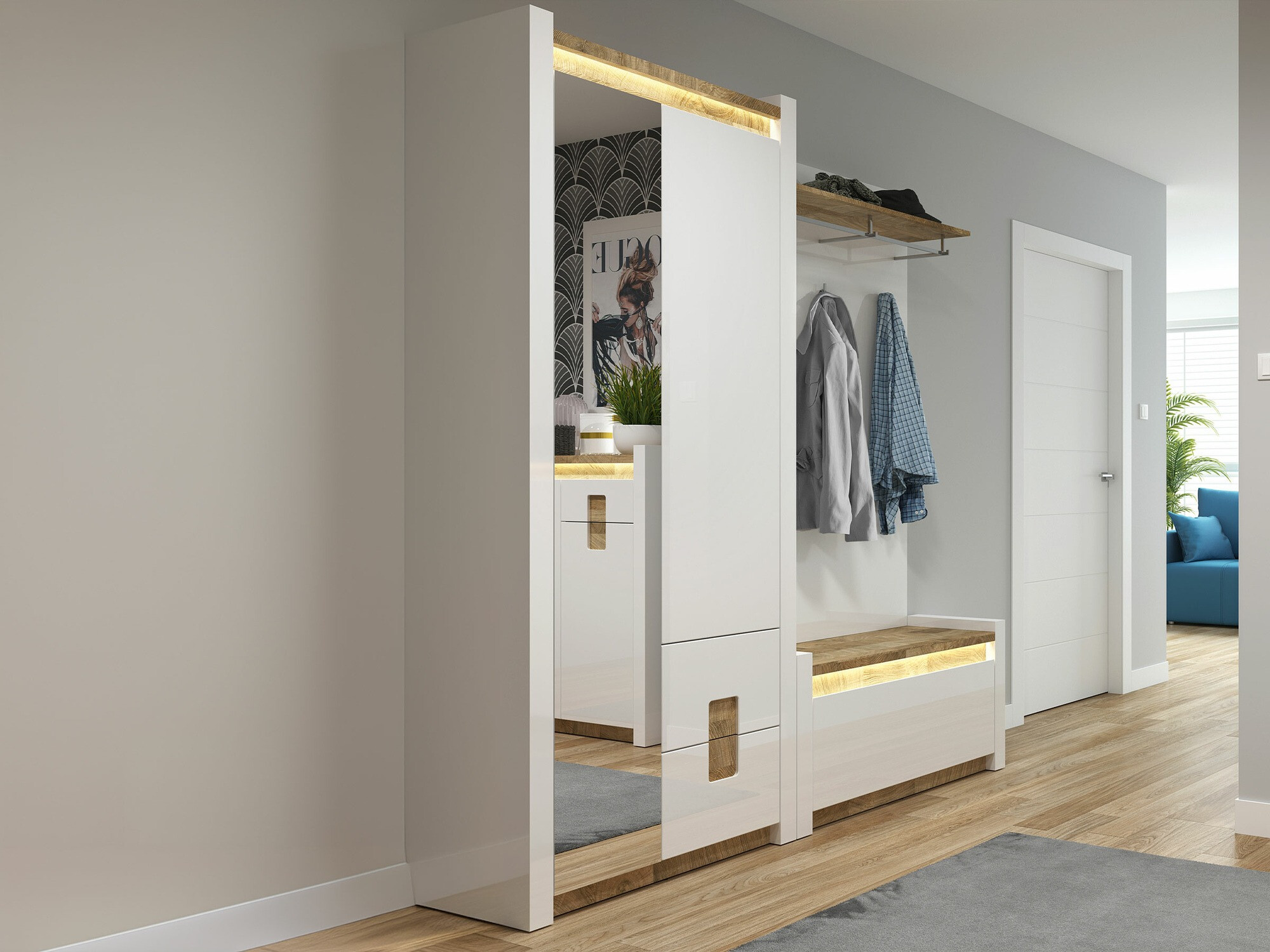 Bij het installeren van het interieur van het huis, is een belangrijke stap om te beslissen welke stemming we willen creëren. Besteed aandacht aan de kleur: lichte kleuren zullen de ruimte optisch vergroten, donkere kleuren zullen het tegenovergestelde doen, verkleinen. Houtkleurige details geven comfort en zien er geweldig uit in het interieur. Deze meubelcollectie is uniek omdat ze een ruime keuze aan meubelmodellen biedt voor verschillende woonruimtes. Creëer een solide interieur in zowel de woonkamer als de slaapkamer. Wat als de meubels ook in de gang passen? Of in het kantoor? Dat is allemaal mogelijk met deze collectie. Het lichte kleurenpalet komt zowel in kleine als grote ruimtes goed tot zijn recht. De gevels van de meubels worden gedomineerd door glanzend wit, dat perfect wordt aangevuld met houtkleurige details. De kleur en de patronen van het hout komen prachtig tot uiting in de meubilairtafels, wat een gevoel van gezelligheid geeft. Ook de greepoplossing springt in het oog, die niet alleen past als handvat, maar ook als decoratief detail. Er zal zeker genoeg ruimte zijn om spullen op te bergen, het meubel heeft voldoende laden en planken. Voor extra charme zorgt de geïntegreerde energiebesparende LED-verlichting. Deze oplossing zal u laten genieten van een gezellig licht dat de houtkleurige inzetstukken zal benadrukken. Het geruisloze sluitmechanisme zal ervoor zorgen dat de deuren en laden niet snel dichtvallen.
