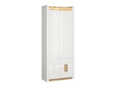 Bij het installeren van het interieur van het huis, is een belangrijke stap om te beslissen welke stemming we willen creëren. Besteed aandacht aan de kleur: lichte kleuren zullen de ruimte optisch vergroten, donkere kleuren zullen het tegenovergestelde doen, verkleinen. Houtkleurige details geven comfort en zien er geweldig uit in het interieur. Deze meubelcollectie is uniek omdat ze een ruime keuze aan meubelmodellen biedt voor verschillende woonruimtes. Creëer een solide interieur in zowel de woonkamer als de slaapkamer. Wat als de meubels ook in de gang passen? Of in het kantoor? Dat is allemaal mogelijk met deze collectie. Het lichte kleurenpalet komt zowel in kleine als grote ruimtes goed tot zijn recht. De gevels van de meubels worden gedomineerd door glanzend wit, dat perfect wordt aangevuld met houtkleurige details. De kleur en de patronen van het hout komen prachtig tot uiting in de meubilairtafels, wat een gevoel van gezelligheid geeft. Ook de greepoplossing springt in het oog, die niet alleen past als handvat, maar ook als decoratief detail. Er zal zeker genoeg ruimte zijn om spullen op te bergen, het meubel heeft voldoende laden en planken. Voor extra charme zorgt de geïntegreerde energiebesparende LED-verlichting. Deze oplossing zal u laten genieten van een gezellig licht dat de houtkleurige inzetstukken zal benadrukken. Het geruisloze sluitmechanisme zal ervoor zorgen dat de deuren en laden niet snel dichtvallen.