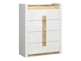 Bij het installeren van het interieur van het huis, is een belangrijke stap om te beslissen welke stemming we willen creëren. Besteed aandacht aan de kleur: lichte kleuren zullen de ruimte optisch vergroten, donkere kleuren zullen het tegenovergestelde doen, verkleinen. Houtkleurige details geven comfort en zien er geweldig uit in het interieur. Deze meubelcollectie is uniek omdat ze een ruime keuze aan meubelmodellen biedt voor verschillende woonruimtes. Creëer een solide interieur in zowel de woonkamer als de slaapkamer. Wat als de meubels ook in de gang passen? Of in het kantoor? Dat is allemaal mogelijk met deze collectie. Het lichte kleurenpalet komt zowel in kleine als grote ruimtes goed tot zijn recht. De gevels van de meubels worden gedomineerd door glanzend wit, dat perfect wordt aangevuld met houtkleurige details. De kleur en de patronen van het hout komen prachtig tot uiting in de meubilairtafels, wat een gevoel van gezelligheid geeft. Ook de greepoplossing springt in het oog, die niet alleen past als handvat, maar ook als decoratief detail. Er zal zeker genoeg ruimte zijn om spullen op te bergen, het meubel heeft voldoende laden en planken. Voor extra charme zorgt de geïntegreerde energiebesparende LED-verlichting. Deze oplossing zal u laten genieten van een gezellig licht dat de houtkleurige inzetstukken zal benadrukken. Het geruisloze sluitmechanisme zal ervoor zorgen dat de deuren en laden niet snel dichtvallen.