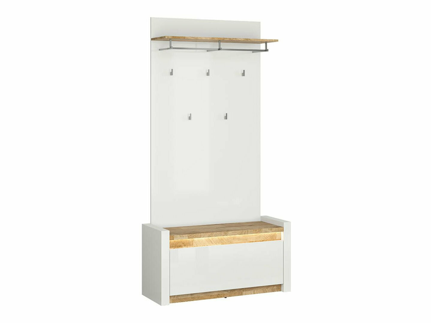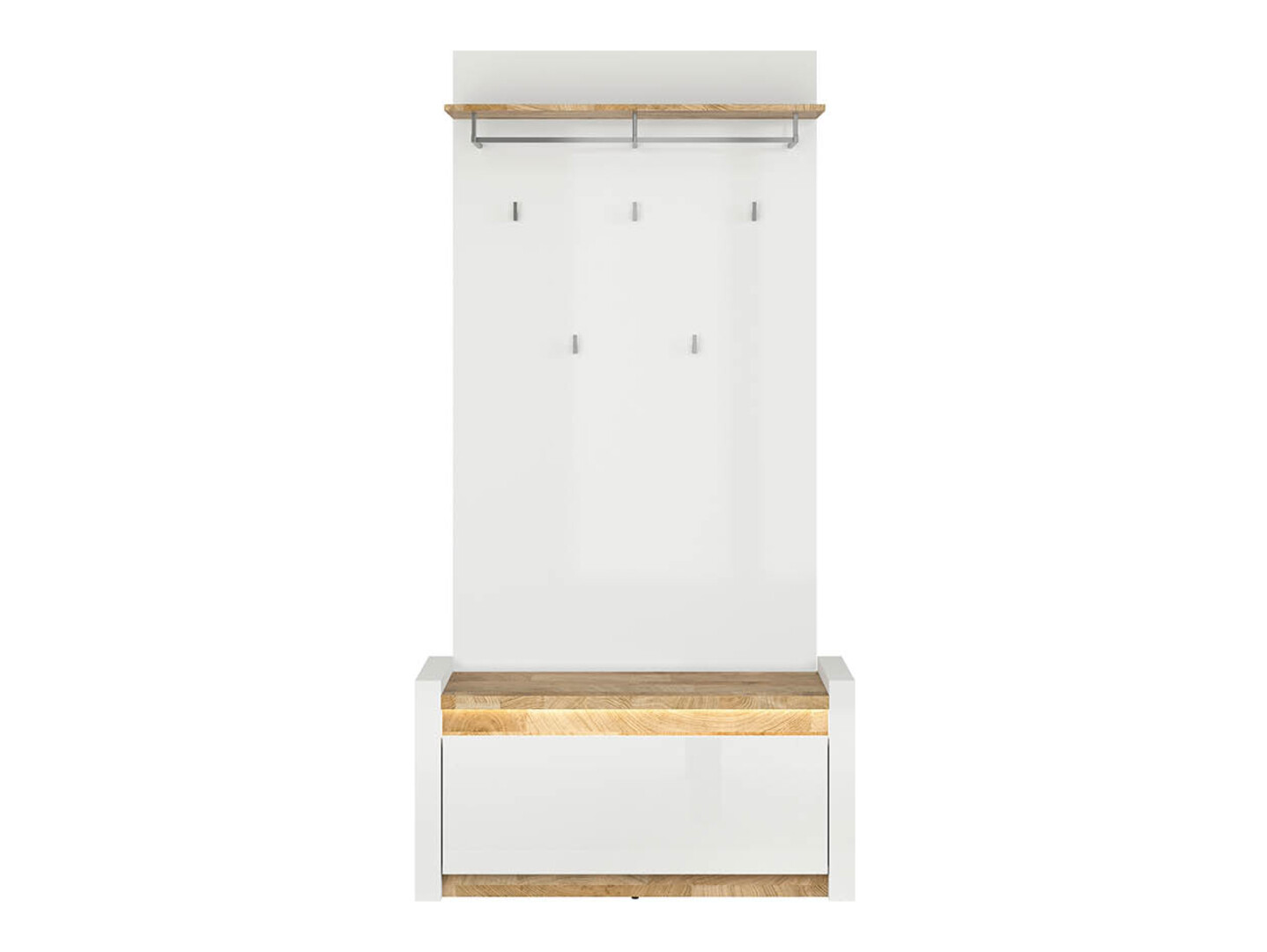 Bij het installeren van het interieur van het huis, is een belangrijke stap om te beslissen welke stemming we willen creëren. Besteed aandacht aan de kleur: lichte kleuren zullen de ruimte optisch vergroten, donkere kleuren zullen het tegenovergestelde doen, verkleinen. Houtkleurige details geven comfort en zien er geweldig uit in het interieur. Deze meubelcollectie is uniek omdat ze een ruime keuze aan meubelmodellen biedt voor verschillende woonruimtes. Creëer een solide interieur in zowel de woonkamer als de slaapkamer. Wat als de meubels ook in de gang passen? Of in het kantoor? Dat is allemaal mogelijk met deze collectie. Het lichte kleurenpalet komt zowel in kleine als grote ruimtes goed tot zijn recht. De gevels van de meubels worden gedomineerd door glanzend wit, dat perfect wordt aangevuld met houtkleurige details. De kleur en de patronen van het hout komen prachtig tot uiting in de meubilairtafels, wat een gevoel van gezelligheid geeft. Ook de greepoplossing springt in het oog, die niet alleen past als handvat, maar ook als decoratief detail. Er zal zeker genoeg ruimte zijn om spullen op te bergen, het meubel heeft voldoende laden en planken. Voor extra charme zorgt de geïntegreerde energiebesparende LED-verlichting. Deze oplossing zal u laten genieten van een gezellig licht dat de houtkleurige inzetstukken zal benadrukken. Het geruisloze sluitmechanisme zal ervoor zorgen dat de deuren en laden niet snel dichtvallen.