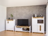 Bij het installeren van het interieur van het huis, is een belangrijke stap om te beslissen welke stemming we willen creëren. Besteed aandacht aan de kleur: lichte kleuren zullen de ruimte optisch vergroten, donkere kleuren zullen het tegenovergestelde doen, verkleinen. Houtkleurige details geven comfort en zien er geweldig uit in het interieur. Deze meubelcollectie is uniek omdat ze een ruime keuze aan meubelmodellen biedt voor verschillende woonruimtes. Creëer een solide interieur in zowel de woonkamer als de slaapkamer. Wat als de meubels ook in de gang passen? Of in het kantoor? Dat is allemaal mogelijk met deze collectie. Het lichte kleurenpalet komt zowel in kleine als grote ruimtes goed tot zijn recht. De gevels van de meubels worden gedomineerd door glanzend wit, dat perfect wordt aangevuld met houtkleurige details. De kleur en de patronen van het hout komen prachtig tot uiting in de meubilairtafels, wat een gevoel van gezelligheid geeft. Ook de greepoplossing springt in het oog, die niet alleen past als handvat, maar ook als decoratief detail. Er zal zeker genoeg ruimte zijn om spullen op te bergen, het meubel heeft voldoende laden en planken. Voor extra charme zorgt de geïntegreerde energiebesparende LED-verlichting. Deze oplossing zal u laten genieten van een gezellig licht dat de houtkleurige inzetstukken zal benadrukken. Het geruisloze sluitmechanisme zal ervoor zorgen dat de deuren en laden niet snel dichtvallen.