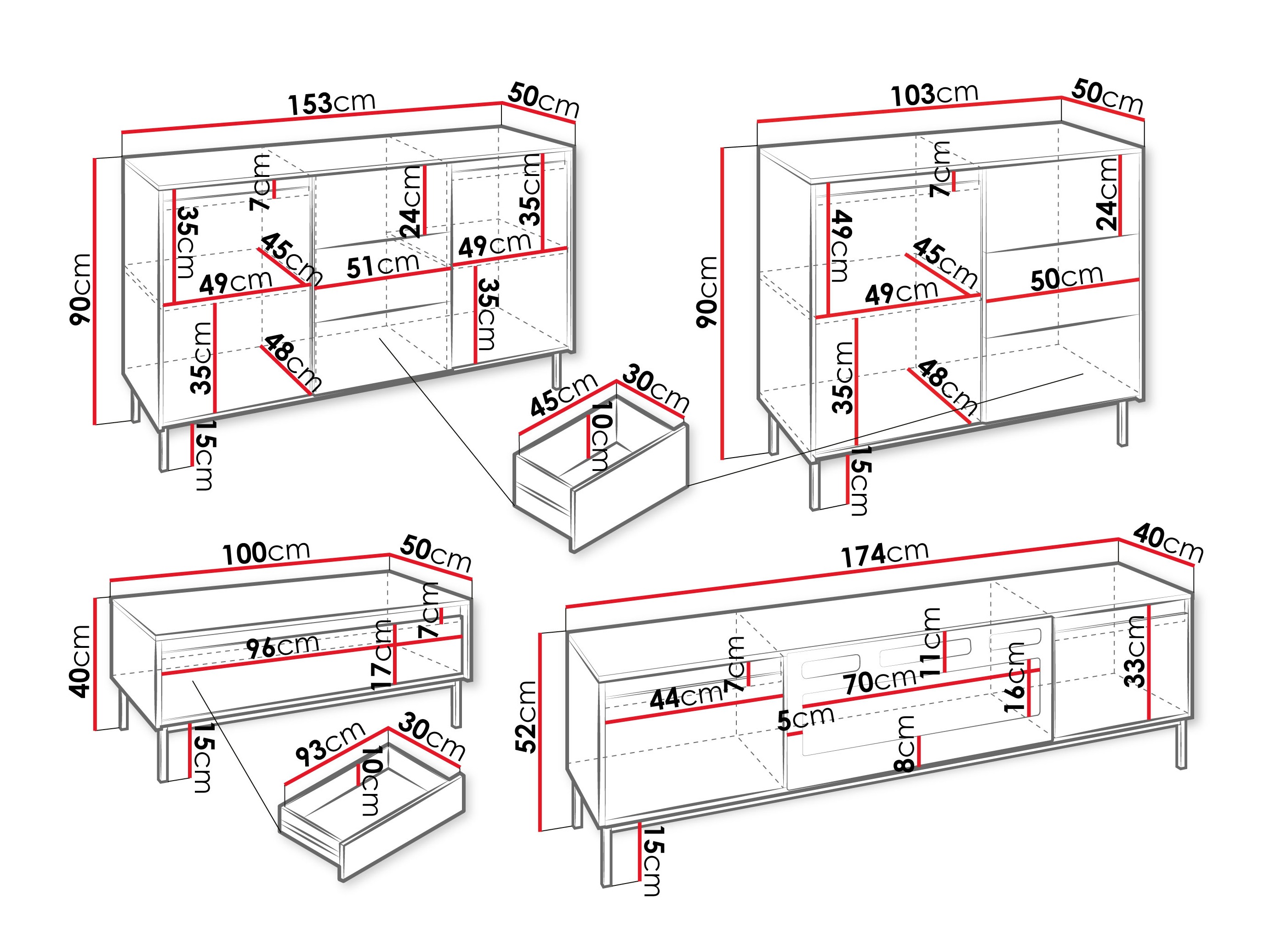 90 x 153 x 50; 90 x 103 x 50 cm