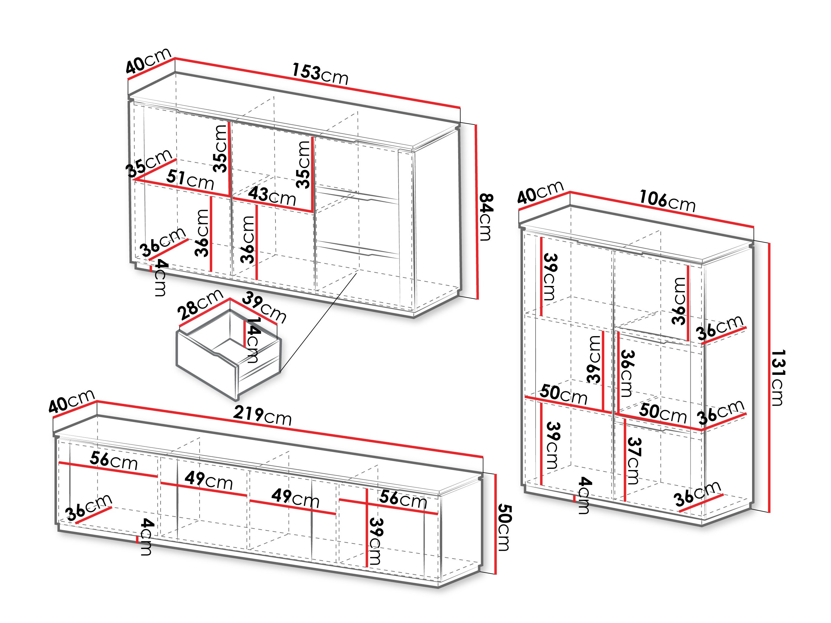 131 x 106 x 40; 84 x 153 x 40 cm