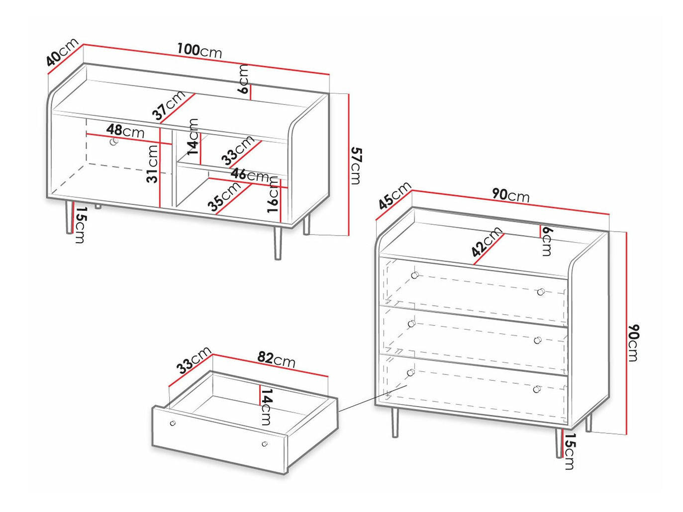 De meubels zijn gemaakt van gelamineerde spaanplaten, waarvan de randen zijn beschermd met speciale ABS-tape. Door de hoogwaardige ABS randen zijn de meubels beter bestand tegen stoten. De deuren en laden hebben een geruisloos sluitmechanisme, waardoor de laden en deuren gemakkelijk en zonder lawaai sluiten. De fronten van de meubelen zijn versierd met kleine zwarte metalen handgrepen, die passen bij de meubelen van deze elegante collectie. Sierlijke metalen poten voegen originaliteit en stijl toe aan onregelmatig gevormde meubels.