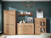 We beginnen gezellige momenten thuis steeds meer te waarderen. Thuis wordt een plek voor rust, werk en ontspanning. De op de natuur geïnspireerde collectie ziet er aantrekkelijk uit met de natuurlijke kleuren en details. Deze collectie is perfect voor wie meer gezelligheid in huis wil creëren. Eenvoudige lijnen en een eikenhouten kleur vormen een exclusief duo. Misschien is deze collectie waar je naar op zoek bent? De gevels van de meubels zijn bedrukt met houten patronen, die de collectie uniek maken. De metalen handgrepen benadrukken het exclusieve ontwerp van de meubels. De decoratieve ornamenten geven het extra karakter, die worden geaccentueerd door LED-verlichting die in de gevels van de meubels is ingebouwd. Ook voor de vitrines heb je LED-verlichting als optie, waardoor de details van het interieur worden benadrukt. "Artisan" eiken gevels, gehard glas, LED-verlichting en metalen handgrepen maken de collectie uniek. Alles wordt gevormd door de perfect benutte ruimte in de meubels. Zo kun je al je belangrijkste spullen netjes opbergen.