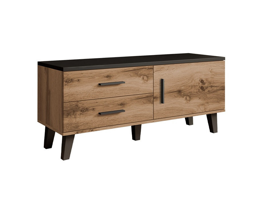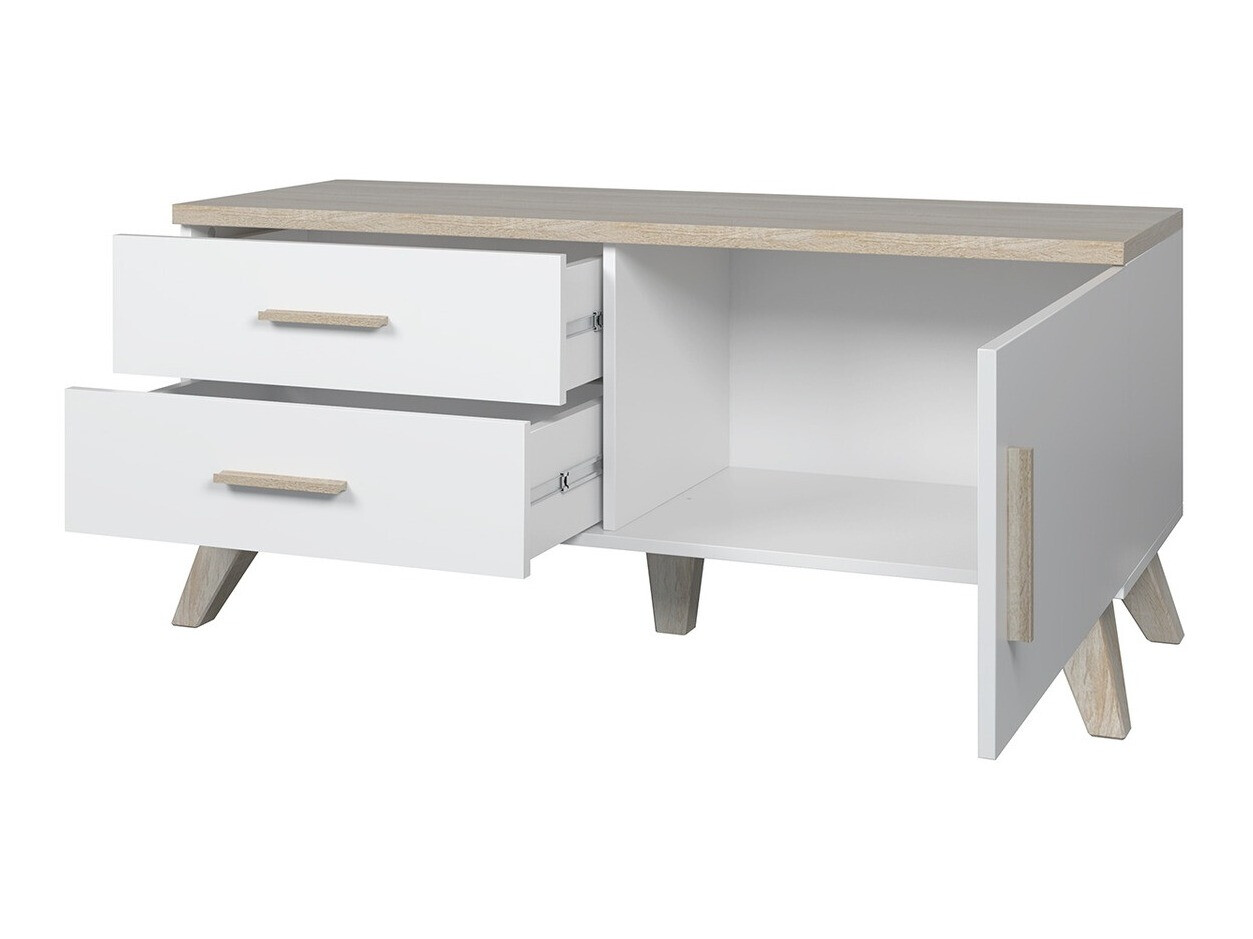 Je herkent de scandinavische kenmerken van de meubelcollectie al van verre - eenvoud, minimalisme en natuurlijkheid. De meubels in deze collectie zijn ontworpen met het oog op dagelijks comfort, dus het ontwerp is gebaseerd op alledaagse benodigdheden: ruime planken en laden, ruime gesloten kasten. Alle meubels zijn gemonteerd op poten van 12 cm, die elk van hen een optische indruk van lichtheid geven, terwijl de langwerpige handgrepen het minimalistische ontwerp versterken. De meubels zijn vol van nordic esthetiek, ook is het perfect aangepast aan moderne elementen zoals volledig glazen vitrine planken, die gerechten of familie souvenirs kunnen houden. De kleuren van de gevels geven harmonie en gezelligheid aan het interieur van de woonkamer. De meubelen uit de collectie zijn verkrijgbaar in verschillende kleuren: "Wotan" eiken met wit of wit met lichte eiken accenten. De collectie omvat alle essentiële meubels voor de woonkamer: salon- en tv-tafels, commode, kast, vitrine en kast.