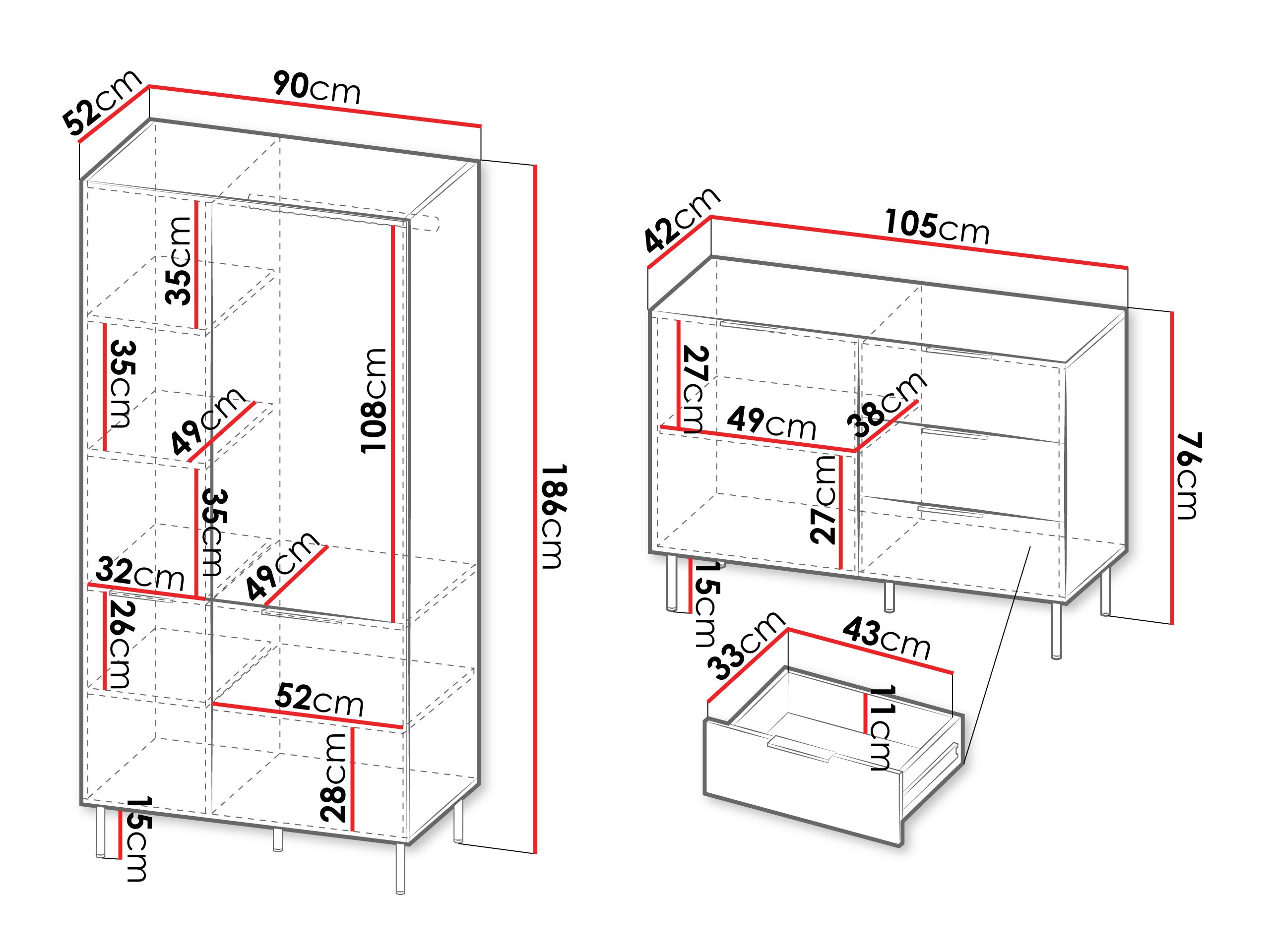 186 x 90 xx 52 cm