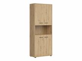 Als je op zoek bent naar meubilair voor een functioneel kantoor - dan is deze collectie voor jou bedoeld. De "Artisan" eiken en zwarte kleurencombinatie voegen moderniteit toe aan het meubilair. De minimalistische zwarte kunststof handgrepen passen perfect in het ontwerp. De meubels in de collectie zijn gemaakt van gelamineerde spaanplaat met een krasbestendig oppervlak. Door deze beschermlaag zijn de meubels niet alleen bestand tegen krassen, maar ook beter beschermd tegen vocht of vlekken. Het in de meubelen ingebouwde geruisloze sluitmechanisme zal de gebruikerservaring verder verbeteren en zorgen voor het geruisloos openen en sluiten van deuren en laden. Het meubel heeft zowel open als gesloten opbergruimtes. Hierdoor kunnen persoonlijke bezittingen worden opgeborgen op zichtbare planken of verborgen achter deuren. De collectie maakt gebruik van warmtebehandeld, gehard matglas. De weerstand ervan is 5-6 keer hoger dan die van gewoon, thermisch onbehandeld glas. Het glas wordt gevormd door een zwart aluminium frame. De planken van de collectie zijn universeel. Tijdens de montage kan worden bepaald in welke richting de deur wordt geopend. De ladeblokken hebben wieltjes in plaats van poten, waardoor het verplaatsen van meubels in de kamer zeer eenvoudig en gemakkelijk wordt. De lock-in planken zorgen ervoor dat persoonlijke spullen nog veiliger kunnen worden opgeborgen. De basis van de bureaus van de collectie is gemaakt van een zwart metalen frame dat voor stabiliteit zorgt. Voor wie een functioneel bureau zoekt, biedt de collectie bureaus met een elektrisch hoogte verstelmechanisme. Met behulp van een paar knoppen verandert de hoogte van de tafel, zodat je nog comfortabeler en ergonomischer je werk kunt doen. Met functionele en universele meubels wordt het inrichten van een kantoorruimte een plezier.