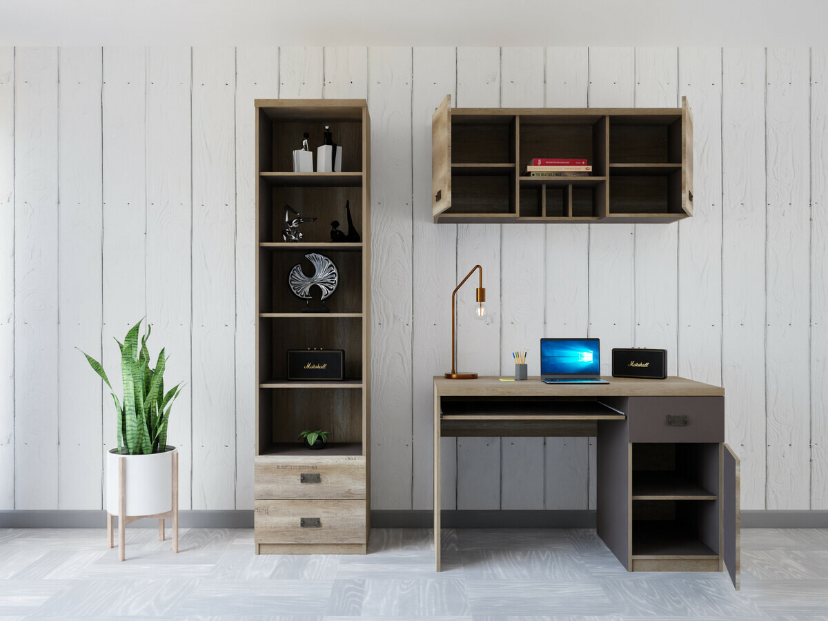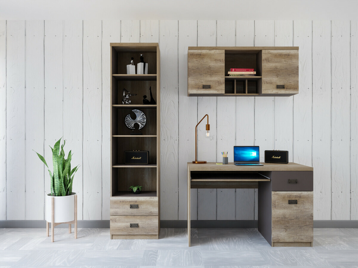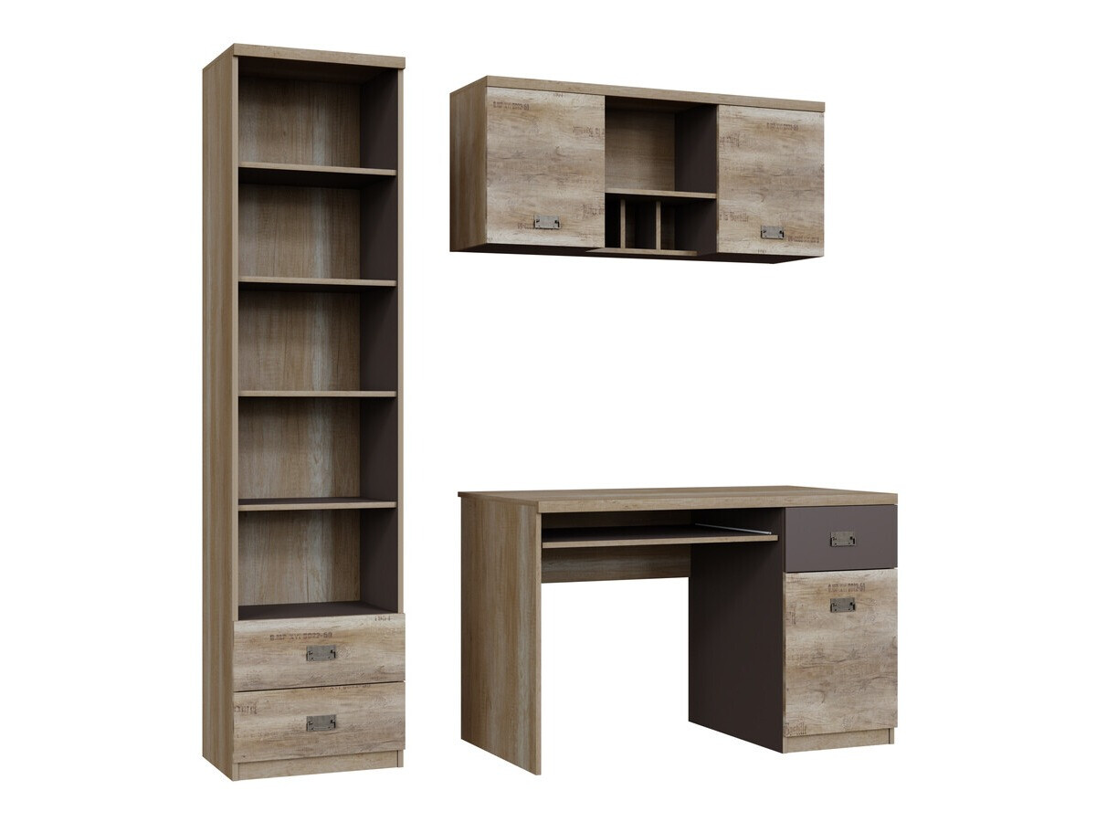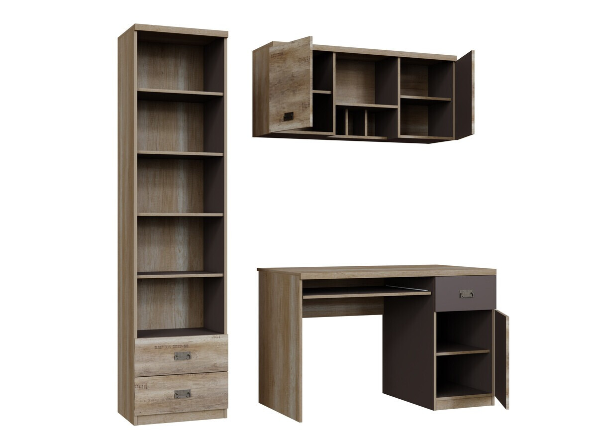 Meubelcollectie - voor liefhebbers van industriële stijl. Dankzij het doordachte ontwerp van het meubilair is er plaats voor al je boeken, schriften of schoolspullen. Het oppervlak van de meubels is bestand tegen kleine krassen. Het jeugdige karakter van de meubels wordt benadrukt door interessante metalen handgrepen. De met noten versierde meubelfronten zorgen voor een industriële sfeer in de kamer. De afzonderlijke elementen van de collectie kunnen gemakkelijk met elkaar worden gecombineerd, zodat hun indeling perfect voldoet aan de individuele behoeften van de jongere.