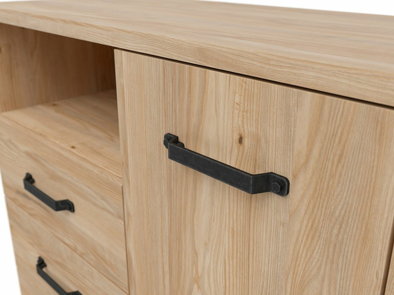 Vrij eenvoudige meubelfronten worden aangevuld met moderne designaccenten - zwarte metalen handgrepen. Deze combinatie van houtkleur en metalen details ziet er uniek uit. Zwarte metalen accenten verschijnen ook in de hoeken van de meubels, die hun vorm en kleur afstemmen op de metalen handgrepen. Deze eenvoudige maar doeltreffende ontwerpoplossingen benadrukken het unieke karakter van de meubelen. De collectie komt perfect tot zijn recht in zowel lichte als donkere interieurs. Kastdeuren en laden hebben een geïntegreerd stil sluitmechanisme, dat meer comfort biedt bij het gebruik van het meubilair, omdat het geen extra geluid veroorzaakt. De meubelcollectie zal helpen om een stijlvolle ruimte voor jonge mensen te creëren.