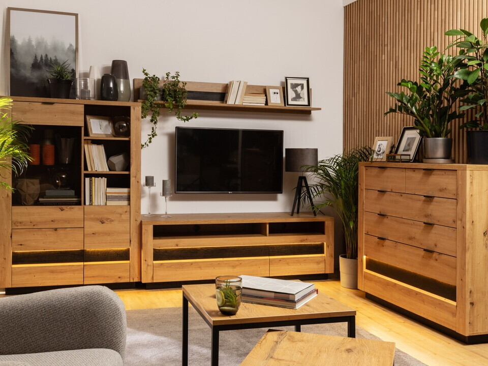Als je ervan houdt als het interieur het houtpatroon en gezellige kleuren weerspiegelt - deze collectie is speciaal voor jou gemaakt. Deze collectie staat in het teken van harmonie en natuurlijkheid, waarbij functionaliteit en onverwachte details niet ontbreken. De heldere kleur van "Artisan" eiken versierd met natuurlijk houtpatroon, aangevuld met zwarte eiken decoraties, is het belangrijkste hoogtepunt van deze collectie. De zwarte metalen handgrepen passen perfect bij de horizontale meubellijnen. De geïntegreerde LED-verlichting geeft de collectie moderniteit en benadrukt het exclusieve design. De meubelen uit deze collectie hebben een soft closing mechanisme, waardoor de deuren en laden vlak voor het sluiten worden gestopt en langzaam worden ingetrokken, zodat ze geen extra geluid veroorzaken. De meubelruimte wordt maximaal benut - brede en ruime laden en planken zijn perfect voor alle belangrijke voorwerpen die in de meubels van deze collectie passen.