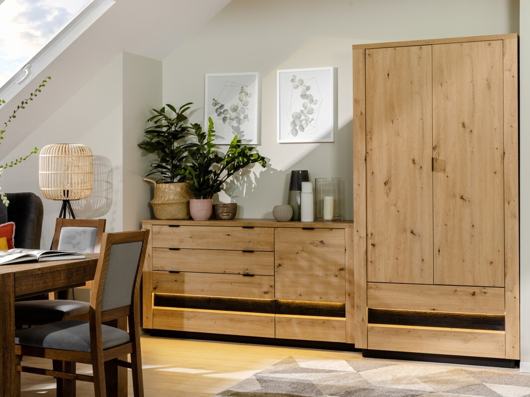 Als je ervan houdt als het interieur het houtpatroon en gezellige kleuren weerspiegelt - deze collectie is speciaal voor jou gemaakt. Deze collectie staat in het teken van harmonie en natuurlijkheid, waarbij functionaliteit en onverwachte details niet ontbreken. De heldere kleur van "Artisan" eiken versierd met natuurlijk houtpatroon, aangevuld met zwarte eiken decoraties, is het belangrijkste hoogtepunt van deze collectie. De zwarte metalen handgrepen passen perfect bij de horizontale meubellijnen. De geïntegreerde LED-verlichting geeft de collectie moderniteit en benadrukt het exclusieve design. De meubelen uit deze collectie hebben een soft closing mechanisme, waardoor de deuren en laden vlak voor het sluiten worden gestopt en langzaam worden ingetrokken, zodat ze geen extra geluid veroorzaken. De meubelruimte wordt maximaal benut - brede en ruime laden en planken zijn perfect voor alle belangrijke voorwerpen die in de meubels van deze collectie passen.