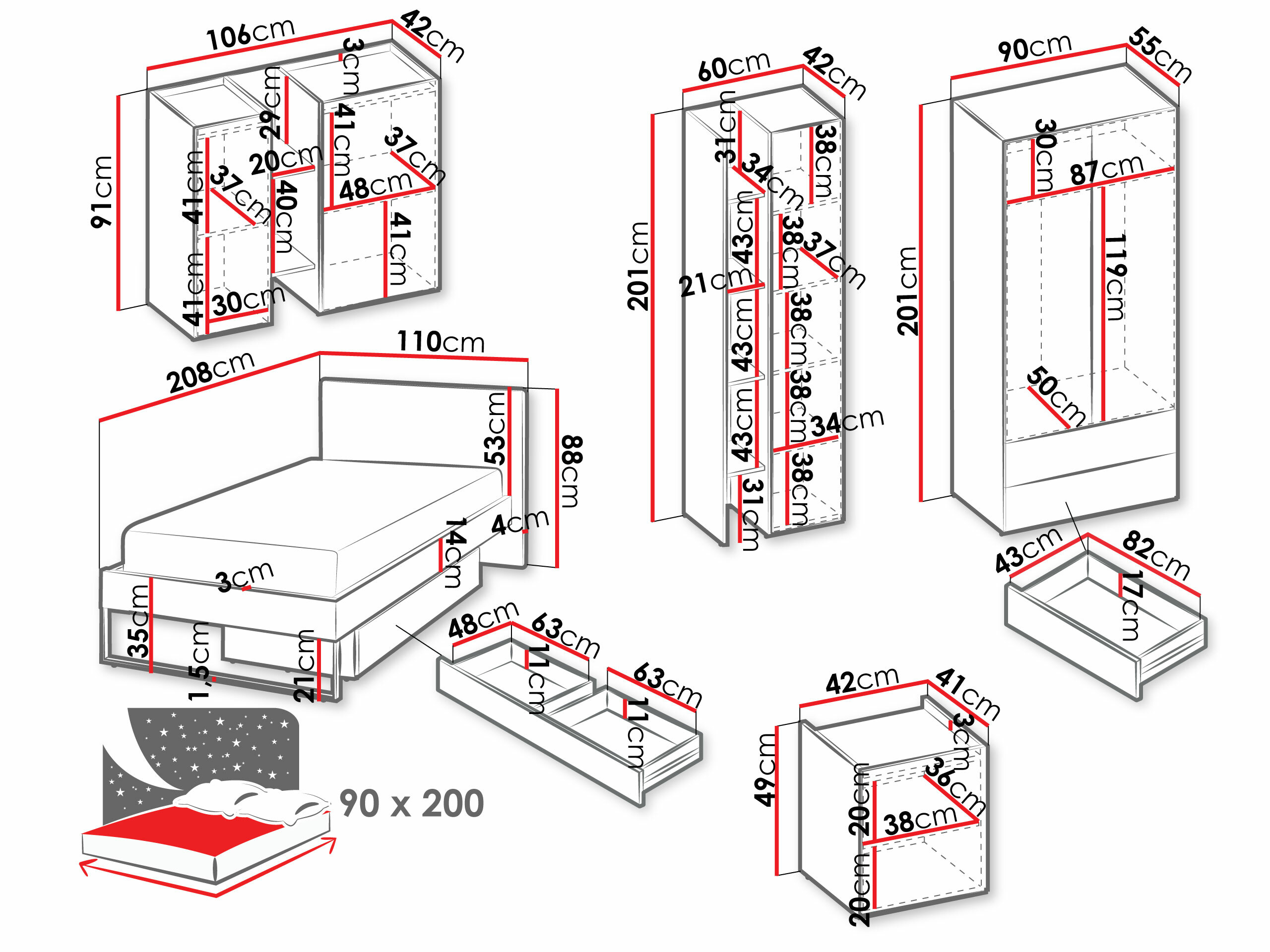 - 90 x 200 cm