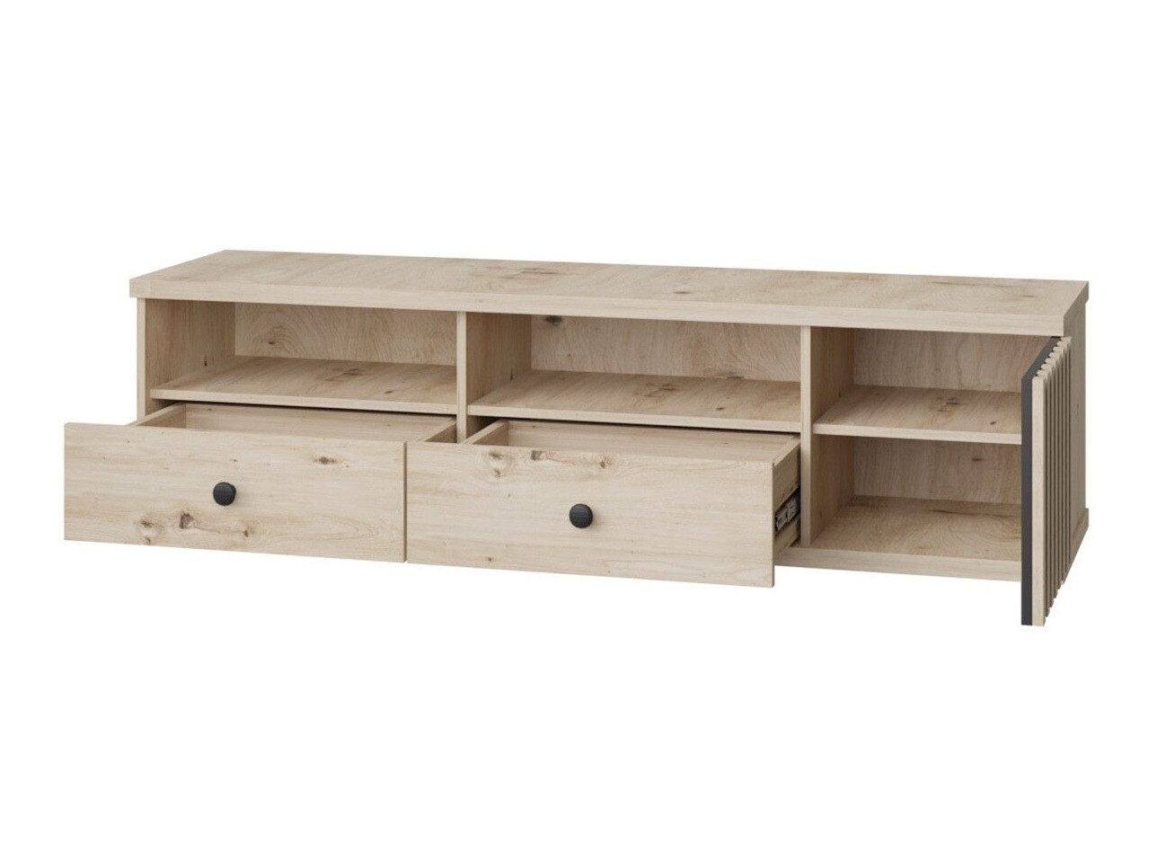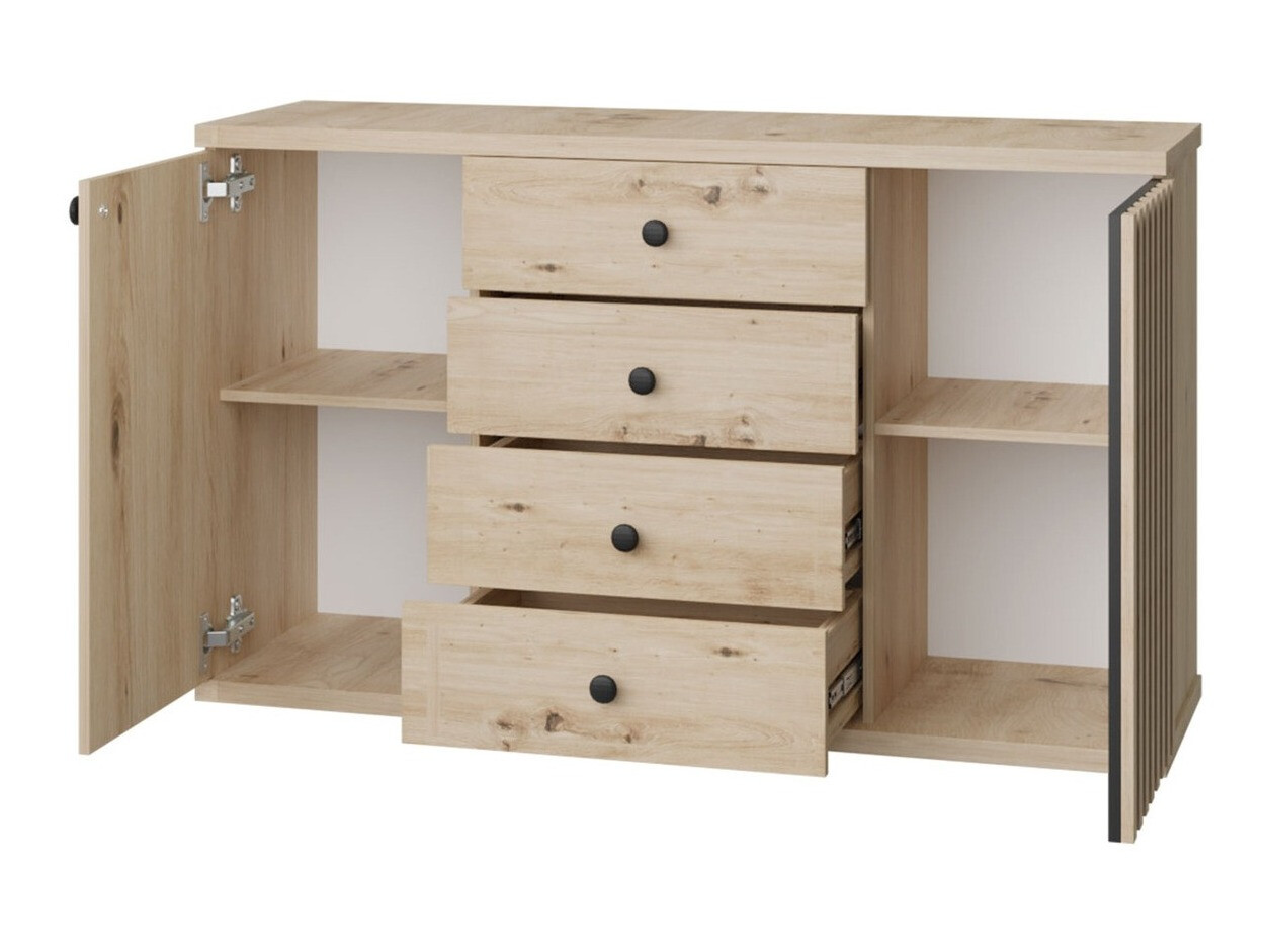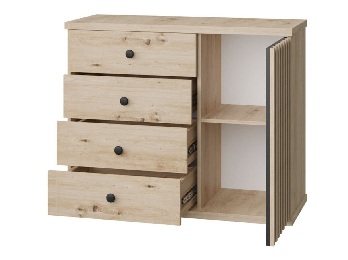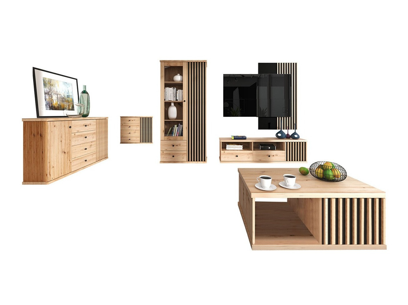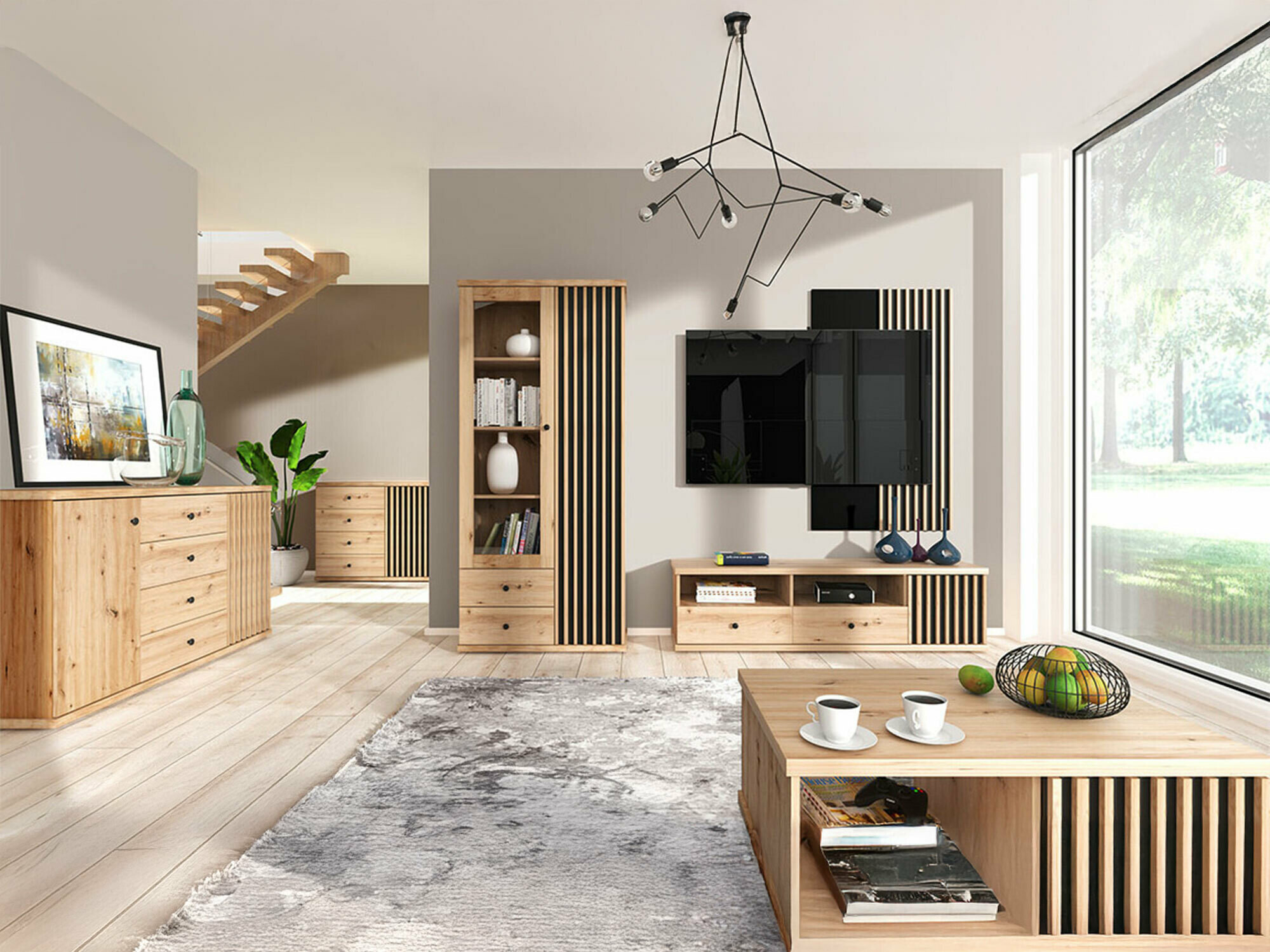 Als u bedenkt hoe een perfecte woonkamer eruit moet zien, is het de moeite waard om de sectie meubelcollecties te bekijken en ideeën op te doen. Als u een gezellige woonkamer wilt creëren, aangevuld met moderne designdetails, dan is deze collectie precies dat. De "Artisan" eikenkleur domineert in de collectie en op de fronten zijn hints van houtpatroon te zien. Kleine zwarte metalen handgrepen passen perfect in het hele ontwerp. Decoratieve verticale lijnen worden een accent van de collectie. Deze oplossing geeft de meubels een exclusief karakter en vervangt tevens de meubelgrepen, waardoor de meubeldeuren kunnen worden geopend. In de meubels ontbreken geen planken en laden, die helpen om de belangrijkste dingen op te bergen. In de meubelen is een stil sluitmechanisme ingebouwd, dat bijzonder is omdat het voorkomt dat deuren en laden snel sluiten. Dankzij speciale dempers worden de deuren en laden vlak voor het sluiten gestopt en langzaam ingetrokken zonder lawaai te maken. Van een kast tot een vitrine, van een tv-tafel tot een hangplank, in deze collectie vindt u diverse meubels voor de woonkamer. Wil je zonder veel moeite een compleet interieur creëren, kies dan voor een meubelset.