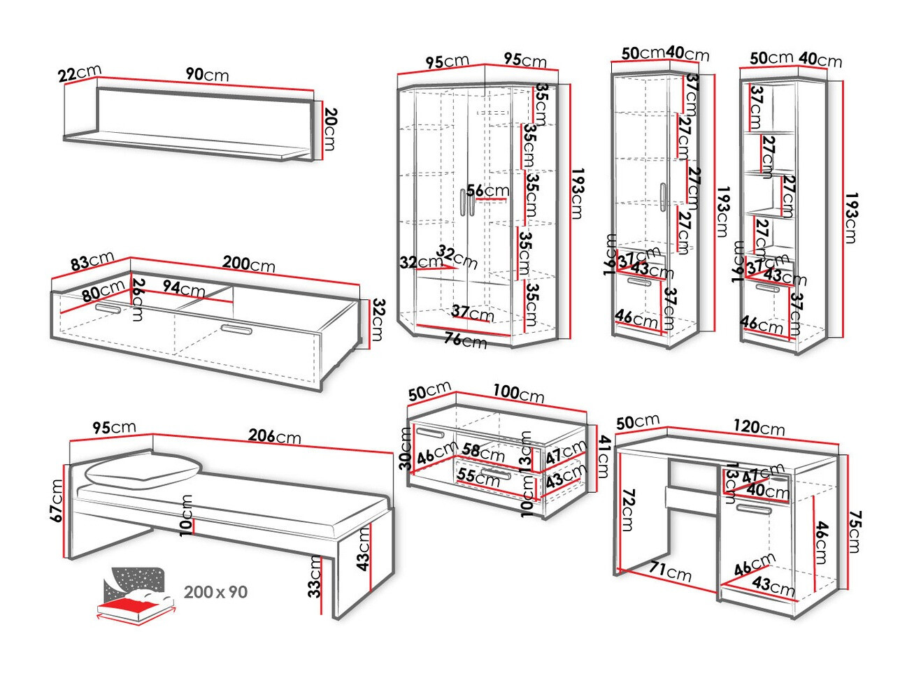 - 90 x 200 cm