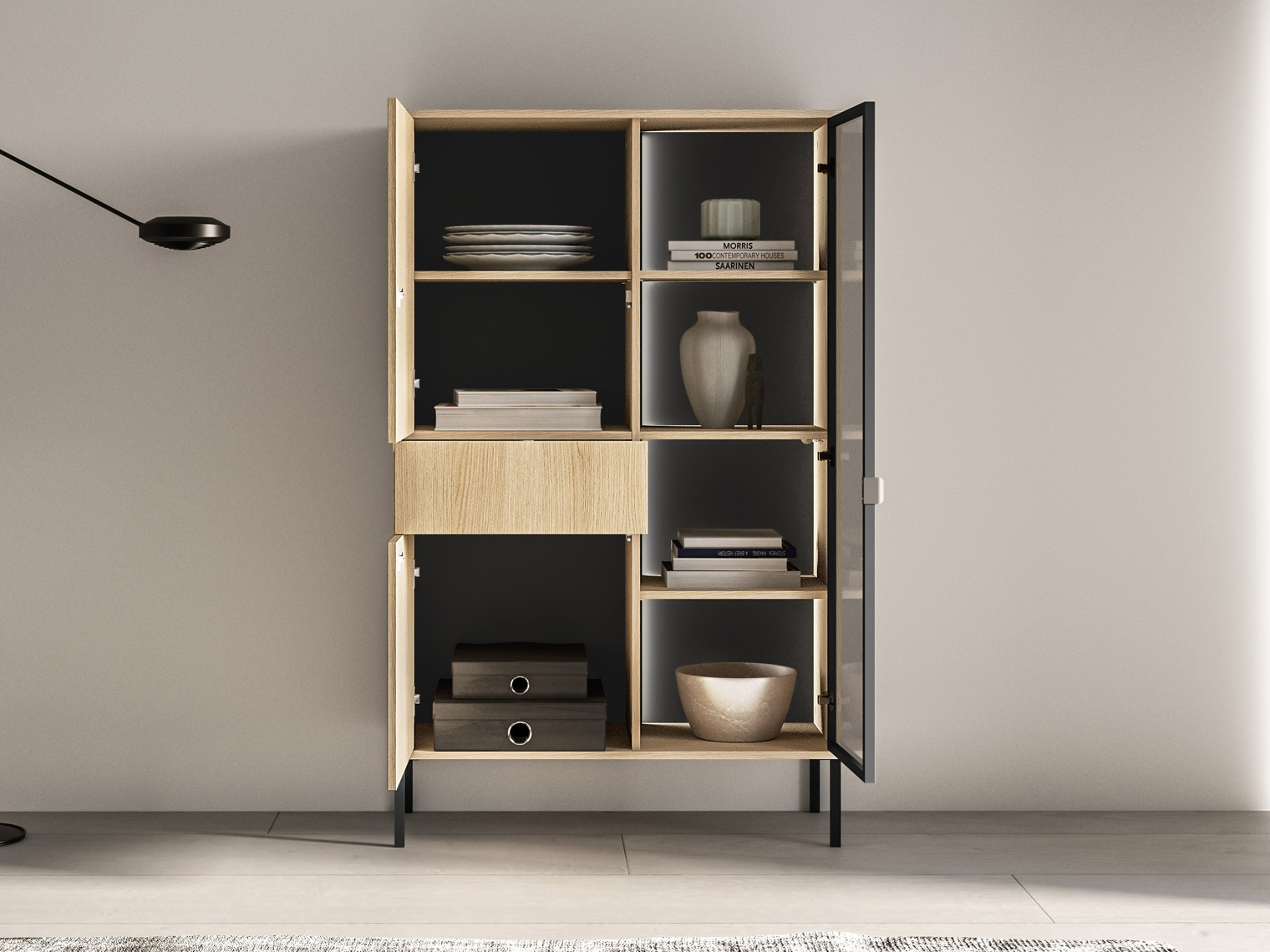 Deze meubels in eigentijdse stijl vallen op door hun strakke lijnen en verfijnde uitstraling, waardoor ze moeiteloos passen in interieurs van verschillende stijlen. Minimalistische handgrepen worden gecombineerd met een handig "push-to-open" systeem, waardoor de fronten visueel strak en rustig blijven. Een geïntegreerd soft-close systeem zorgt ervoor dat deuren en lades langzaam en geruisloos sluiten. Ingebouwde LED-verlichting in de planken voegt extra warmte en moderniteit toe, door de ruimte subtiel te verlichten en de designdetails van het meubel te benadrukken. Een uitstekende keuze voor wie op zoek is naar meubels die functionaliteit combineren met een elegante uitstraling.