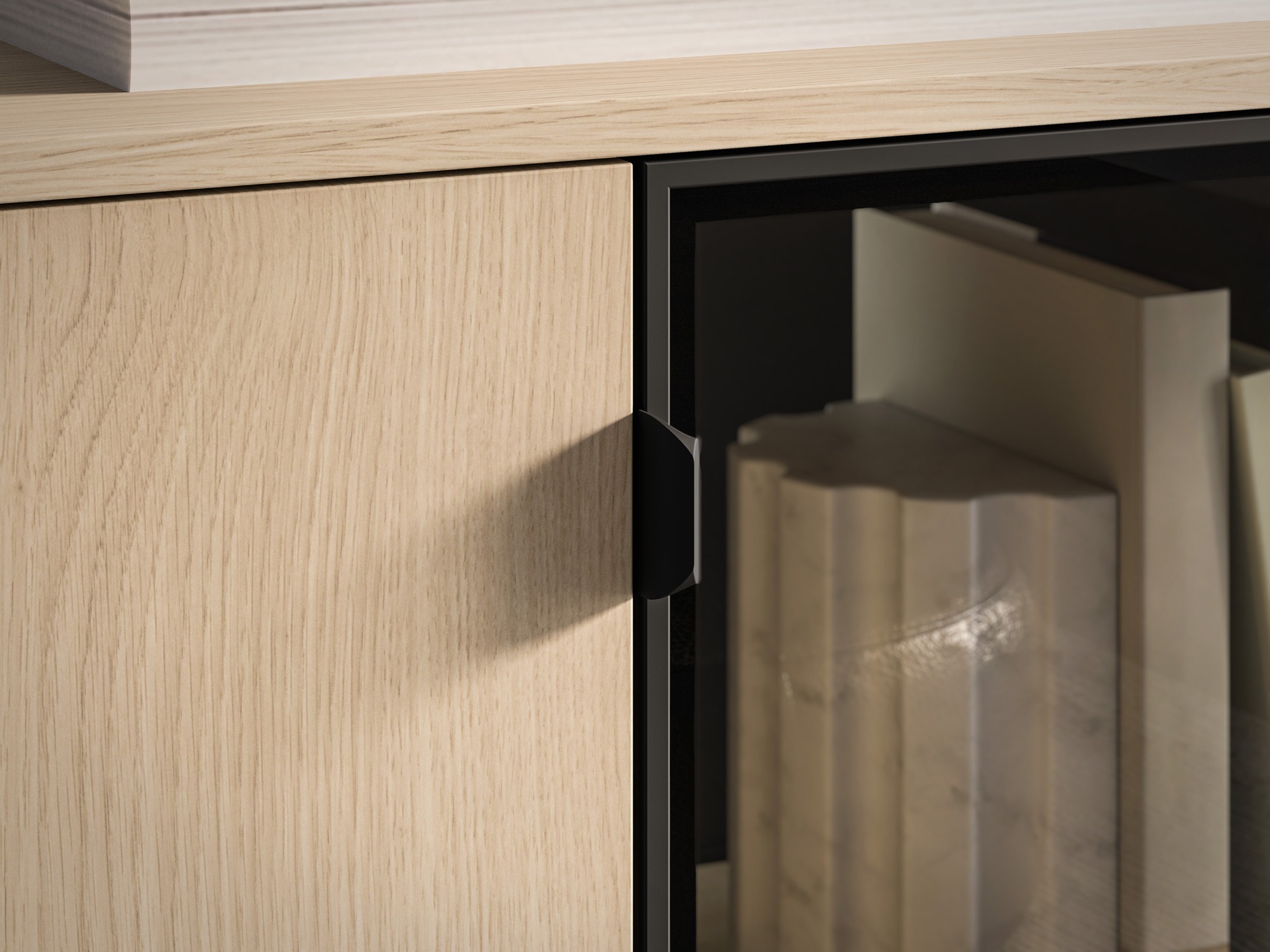 Open deuren en laden met slechts één aanraking. Het "Push to open"-systeem bestaat uit een veer- en magneetmechanisme om de deur in te drukken en vast te houden. Het heeft ook scharnieren met speciale drukveren om de deur te openen. Dankzij dit mechanisme heeft het meubel geen handgrepen nodig. Je kunt deuren en laden met één klik openen en sluiten.